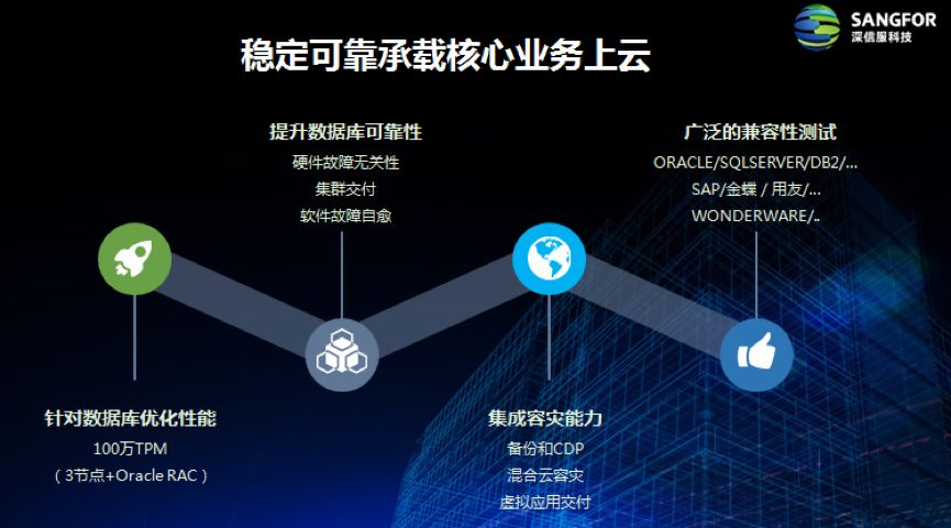 关键业务上云,一直是深信服企业级云的核心优势。借助超融合技术,深信服企业级云针对关键业务应用对稳定性、性能和网络安全的高要求作了优化提升,能够稳定承载各类关键应用迁移上云,包括用友、医疗HIS系统、国土不动产登记、公积金系统、SAP等数十种大型业务软件,以及Oralce RAC、SQL Server等主流数据库,以高可靠、高性能、简单易用和更高的安全性,为企业关键业务上云提供多重保障。