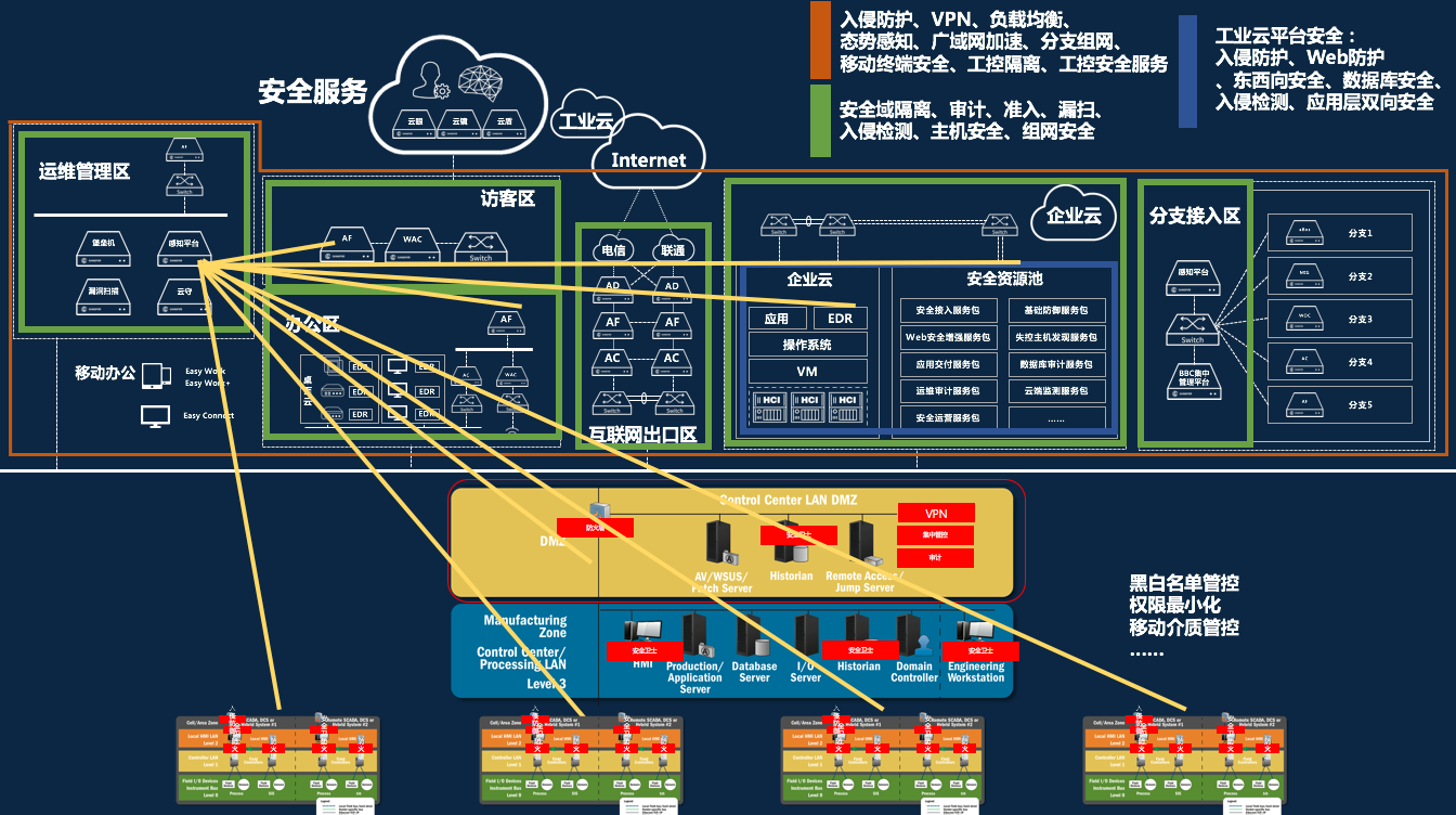制造业遭受僵木蠕、黑客的攻击无外乎两种情况,第一种是从互联网、办公网跳板进入生产网,第二种是通过USB、流氓设备等方式从生产网内部感染。因此,建议的安全整改措施有: