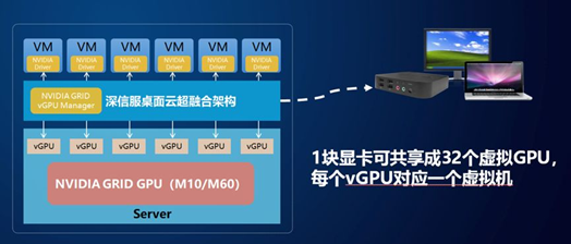 在桌面云市场,深信服已经累计交付终端超过40万台,目标是要让桌面云在体验上媲美PC,而要实现这一目标,就必须用好GPU。结合NVIDIA市场领先的Tesla® GPU及 NVIDIA虚拟GPU软件优势与深信服桌面云软硬件融合与传输协议优化的优势,实现了更加成熟的基于KVM架构的vGPU虚拟化技术,将vGPU做到与物理GPU一致的应用体验,且更具成本优势。深信服要将vGPU技术打造成公司重要的产品能力。