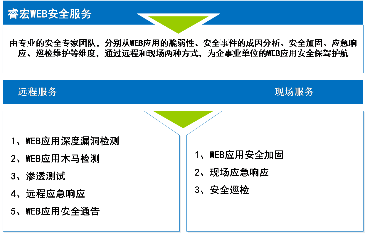 如何确保WEB应用的安全成为各企事业单位目前密切关注的问题。为了更好地解决以上所述问题,睿宏科技提供的WEB应用安全服务,由专业的安全专家团队,分别从WEB应用的脆弱性、安全事件的成因分析、安全加固、应急响应、巡检维护等维度,通过远程和现场两种方式,为企事业单位的WEB应用安全保驾护航。